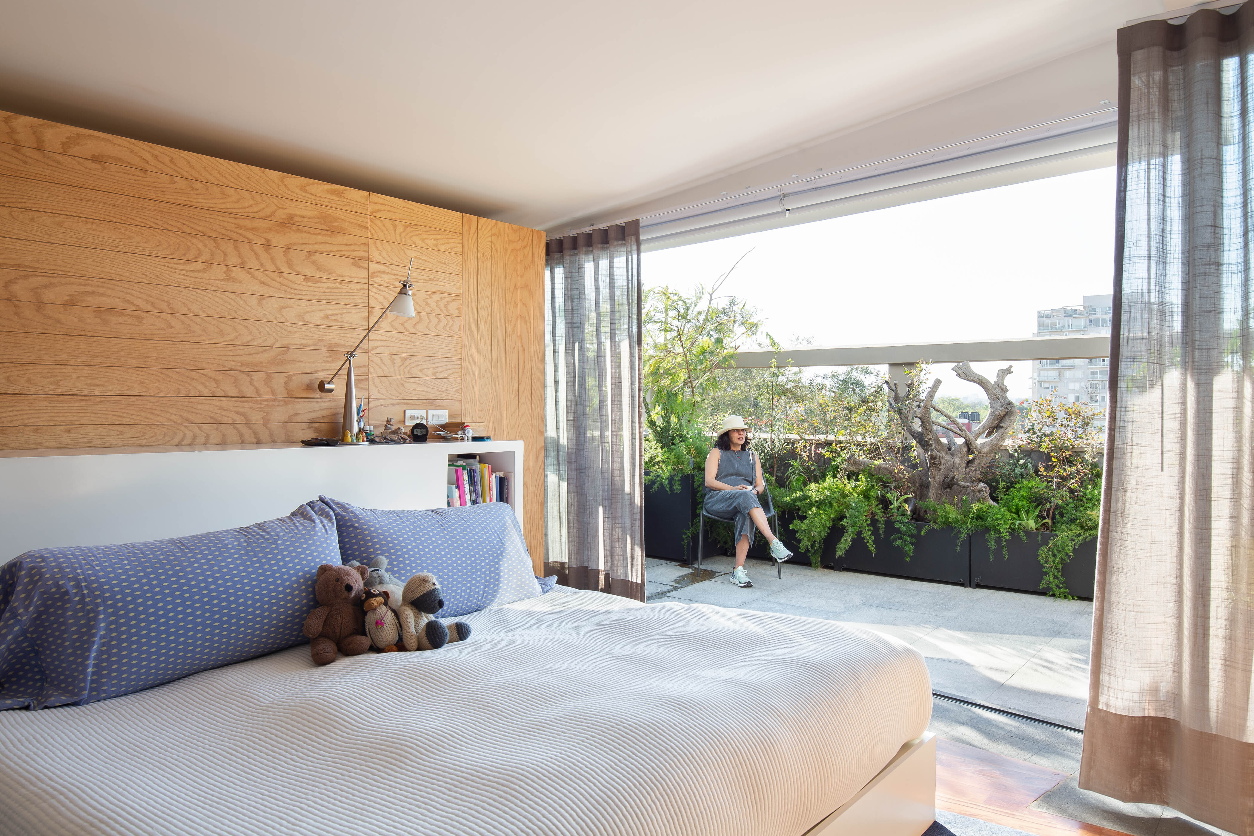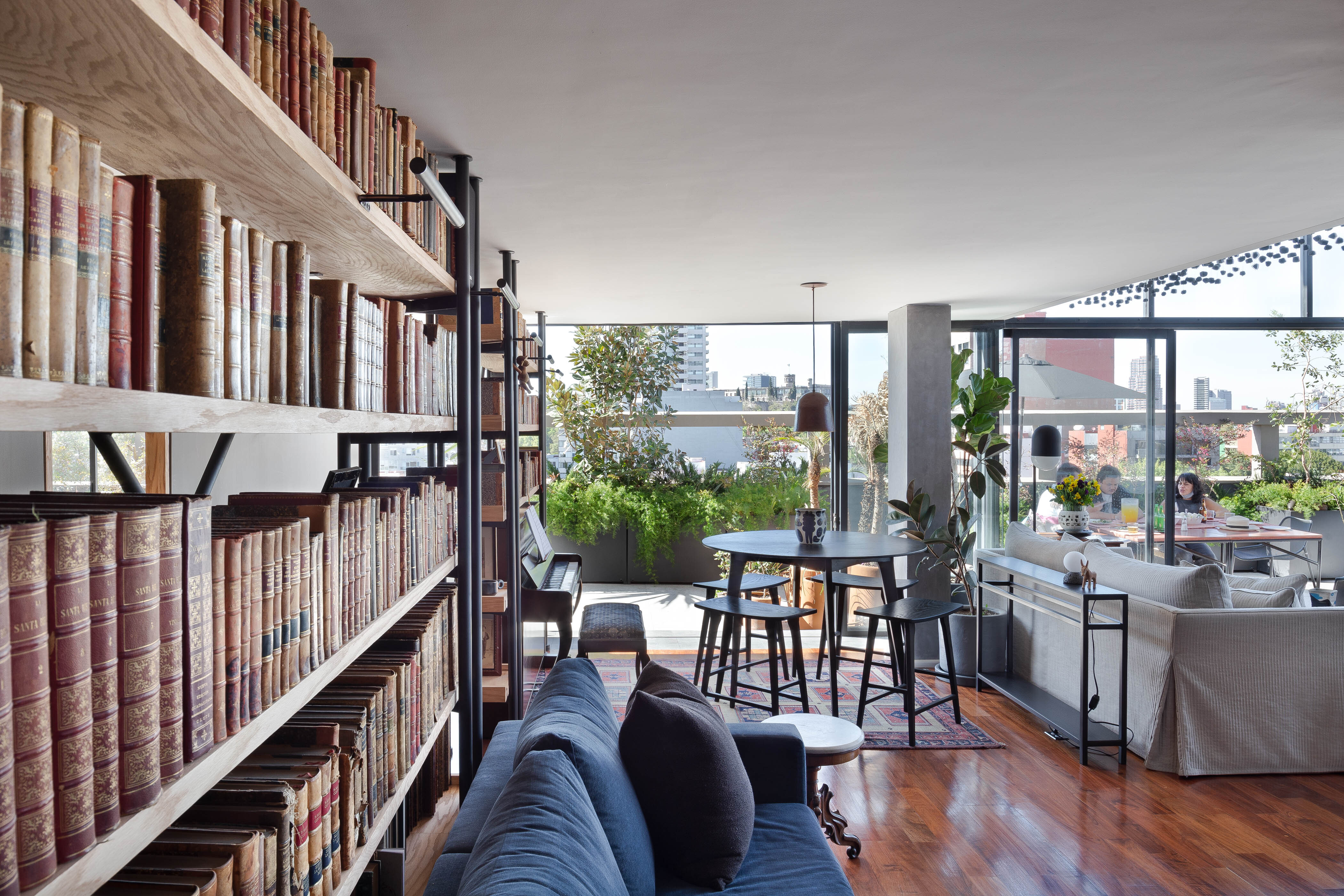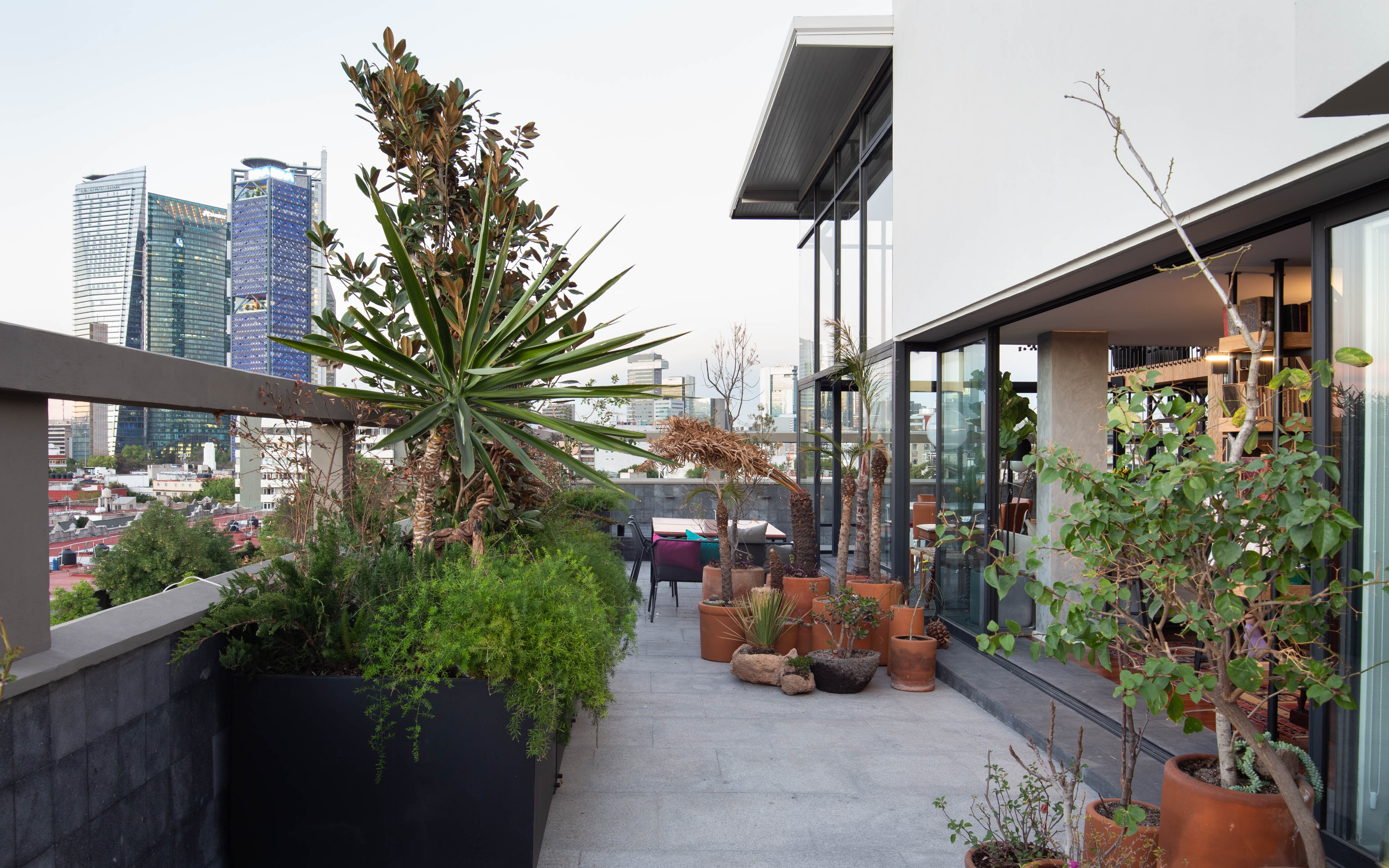 Debido a que el proyecto se realizó durante COVID-19, la ventilación cruzada, la doble altura y la terraza amplia con vista hacia Av. Reforma se convirtieron en lo más importante y por ello, el diseño de paisaje también tomó relevancia; es a través de él que se enmarca el exterior y se protege del calor. La vegetación emula la cualidad frondosa de los bosques a través de diferentes plantas, árboles y arbustos como los romeros, festucas, olivos, juníperos, ayubes, salvias y santolinas.